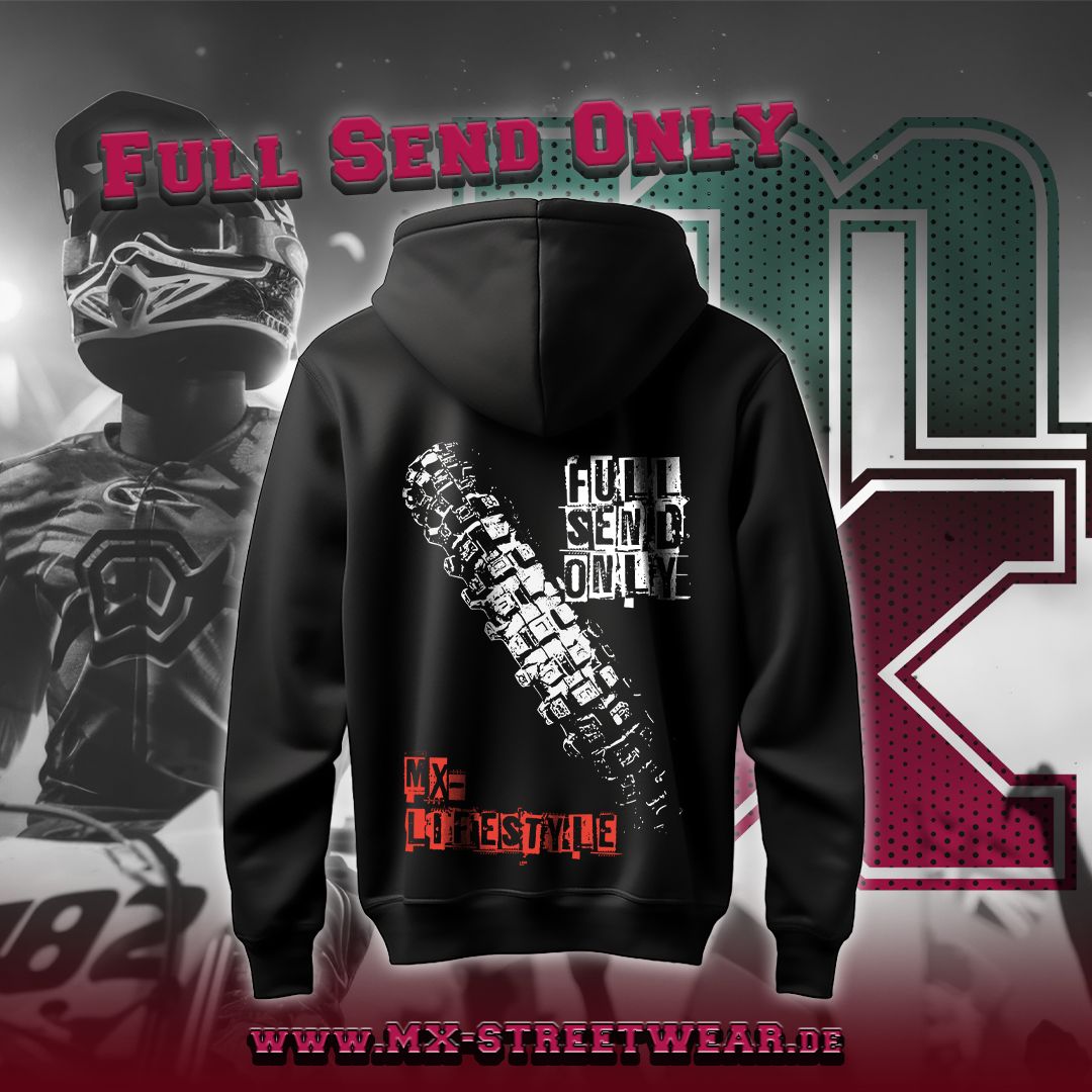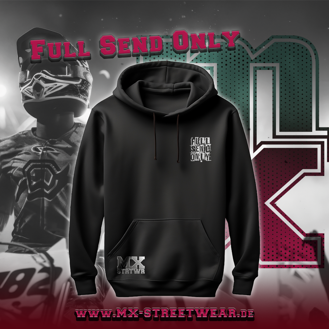 Dieser Hoodie ist gemacht für echte MX-Enthusiasten! Mit seinem kraftvollen Design und dem ikonischen „Full Send Only“-Statement ist er perfekt für alle, die keine halben Sachen machen – ob auf der Strecke oder im Alltag.
