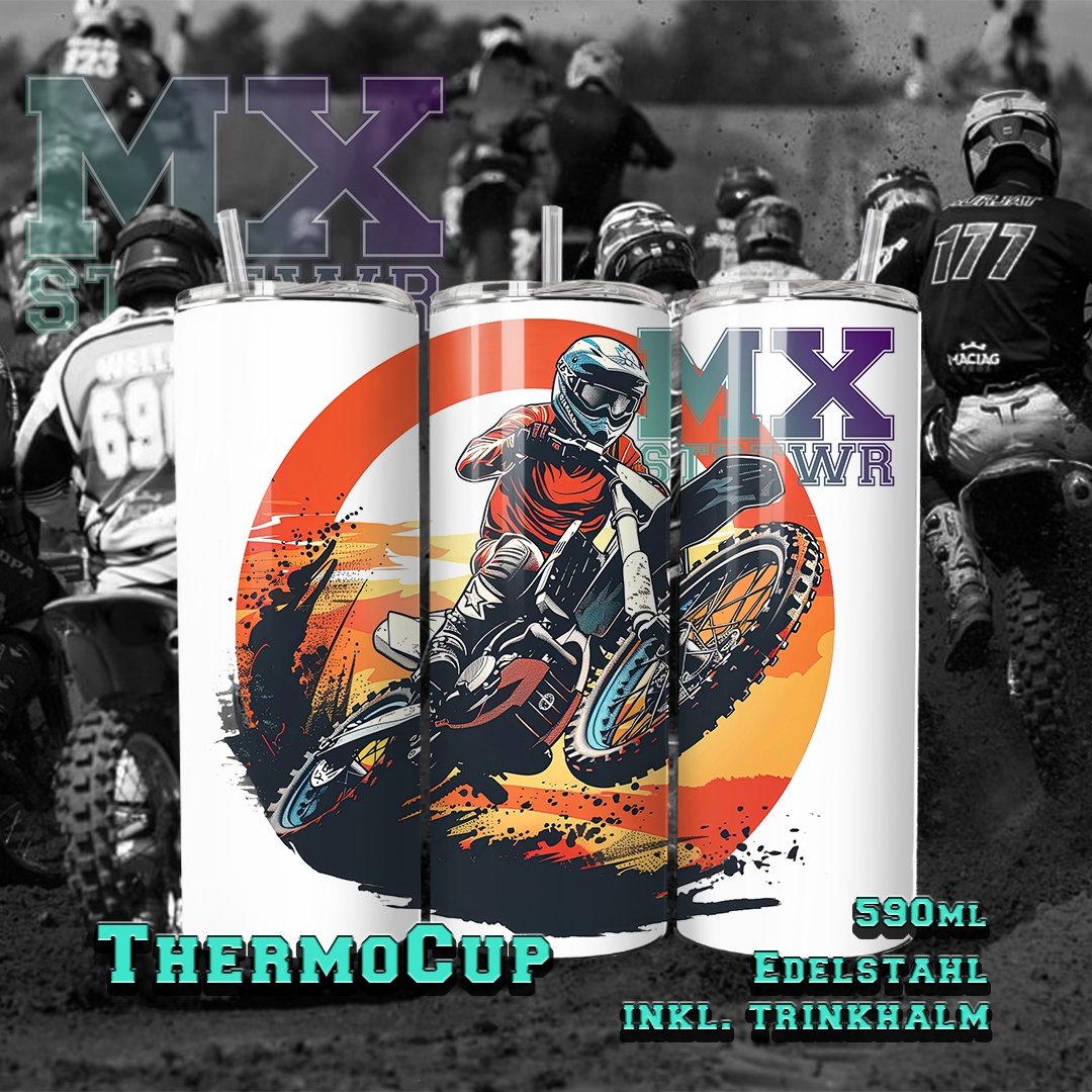 Der MX Streetwear ThermoCup – Sunrise Edition bringt das ultimative Motocross-Feeling in deinen Alltag. Mit seinem energiegeladenen Design fängt er die Dynamik eines Rennmorgens ein und hält dein Lieblingsgetränk genau auf der richtigen Temperatur!